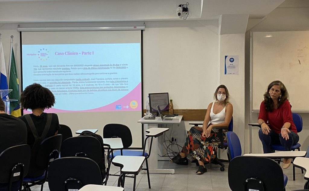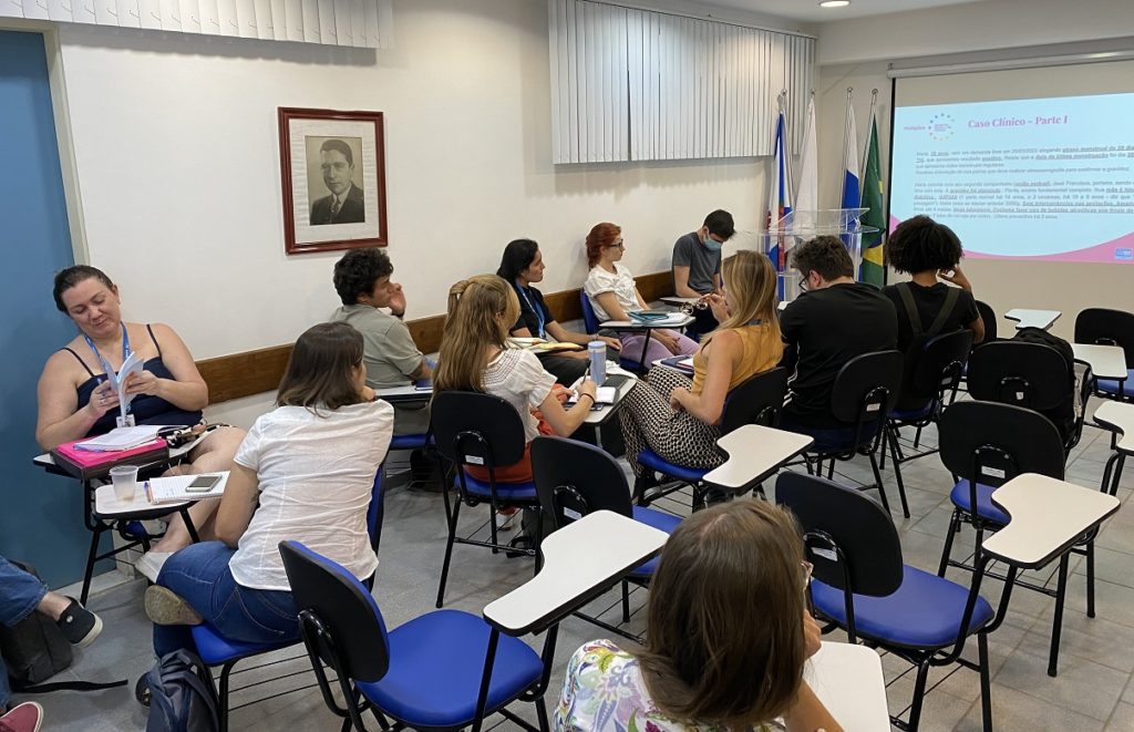Foram debatidos diferentes casos clínicos e havia em torno de 40 residentes juntamente com a preceptora Ana Paula Cigerza.