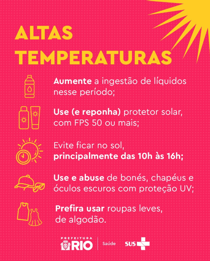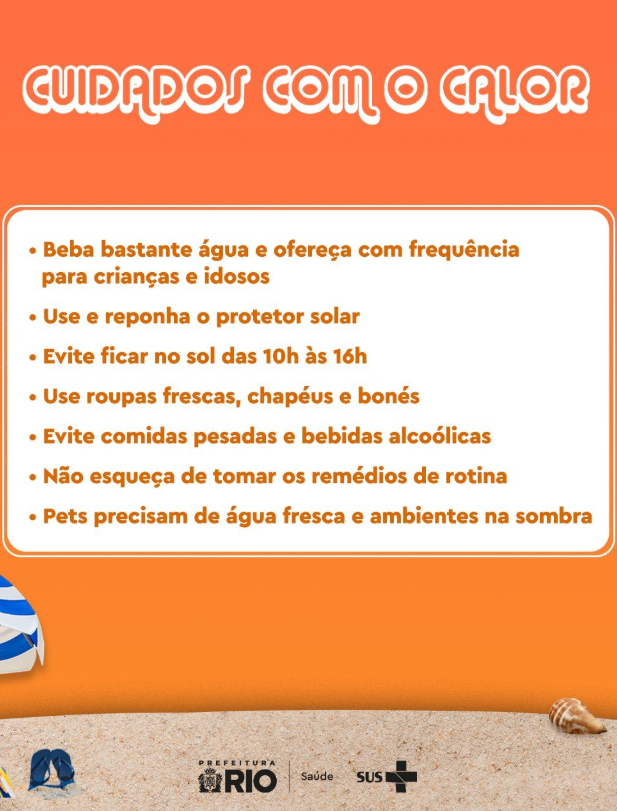 Com as altas temperaturas e a intensa exposição ao sol que têm sido registradas no Rio de Janeiro, torna-se fundamental reforçar os alertas relacionados aos riscos do calor excessivo à saúde da população. Nesse período, destaca-se o Dezembro Laranja, campanha nacional de conscientização para a prevenção do câncer de pele, que chama atenção para os cuidados necessários diante da exposição solar prolongada. O calor intenso pode provocar desidratação, insolação, queda de pressão arterial e agravamento de doenças crônicas, exigindo atenção contínua e medidas preventivas.