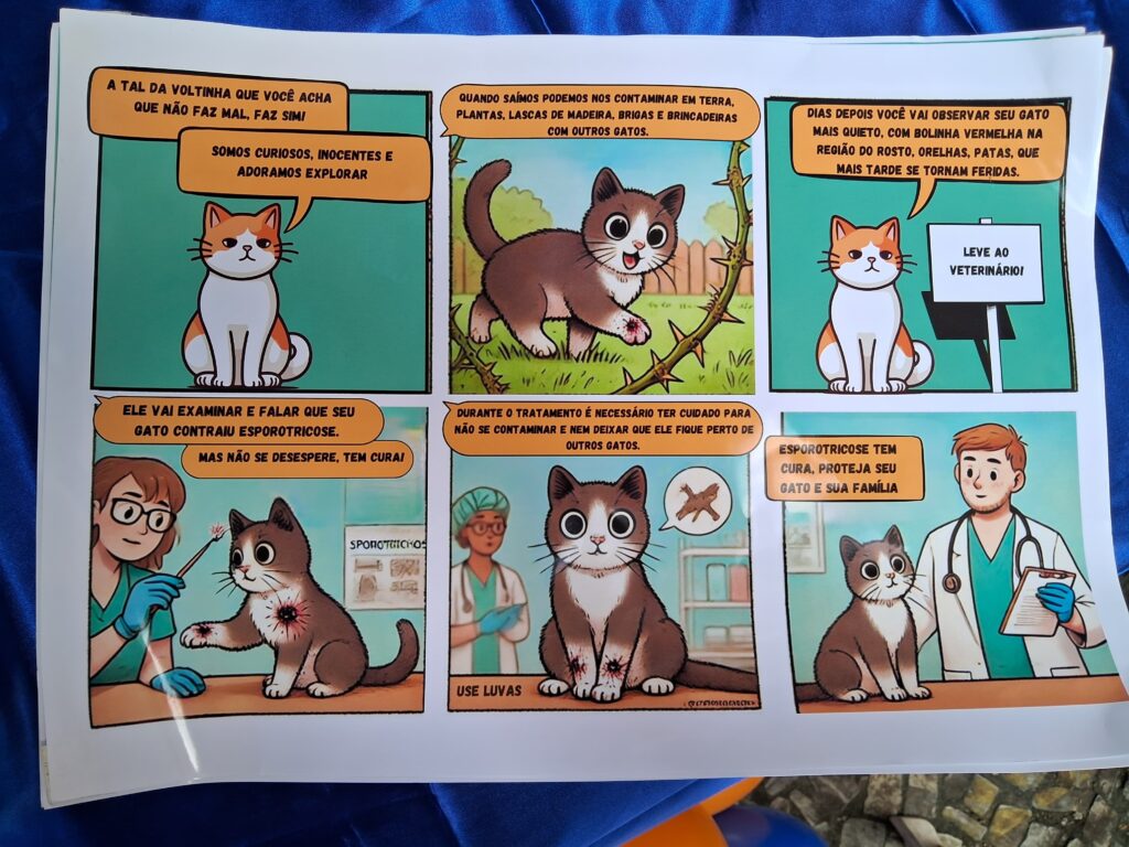 Durante o evento, foi montada uma mesa expositiva com materiais ilustrativos, incluindo fotos reais de casos de esporotricose em humanos e animais, folders informativos e banners com explicações claras e objetivas sobre a doença. Os conteúdos abordaram de maneira didática a origem da esporotricose, os principais sintomas clínicos, os meios de contágio, formas de prevenção e o tratamento indicado. Os materiais foram preparados para facilitar a compreensão tanto de adultos quanto de crianças, criando um ambiente acolhedor e propício ao aprendizado.