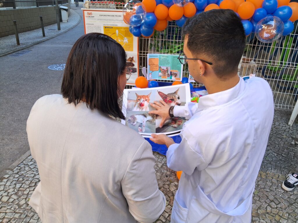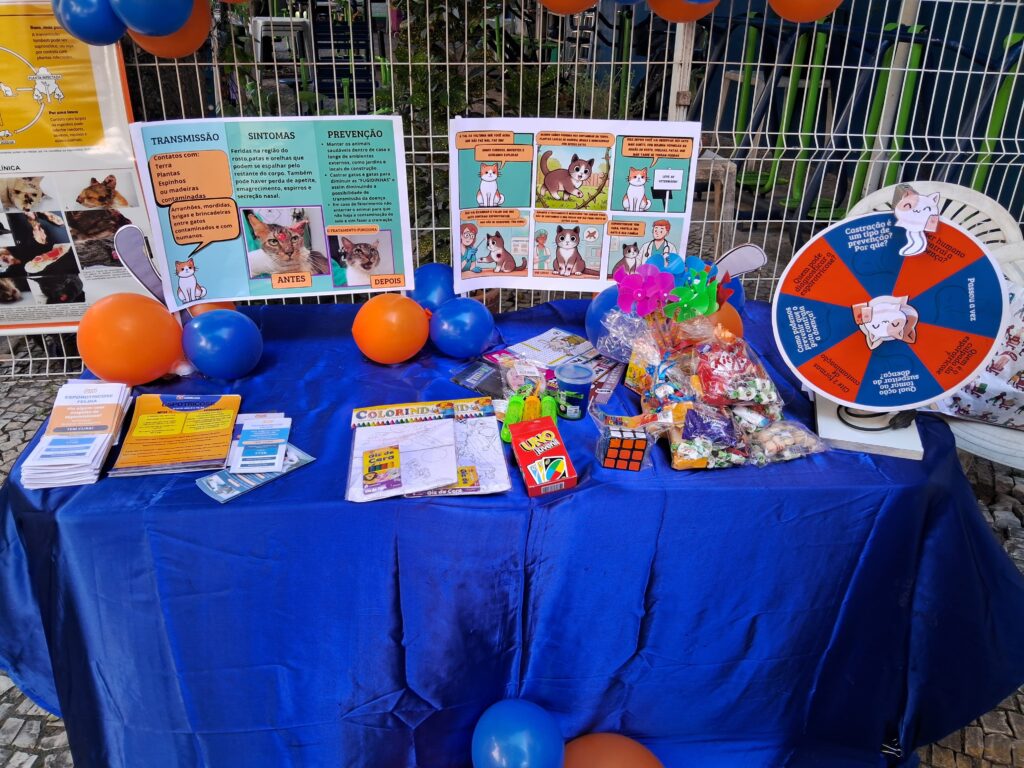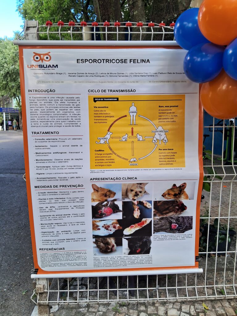 Durante o evento, foi montada uma mesa expositiva com materiais ilustrativos, incluindo fotos reais de casos de esporotricose em humanos e animais, folders informativos e banners com explicações claras e objetivas sobre a doença. Os conteúdos abordaram de maneira didática a origem da esporotricose, os principais sintomas clínicos, os meios de contágio, formas de prevenção e o tratamento indicado. Os materiais foram preparados para facilitar a compreensão tanto de adultos quanto de crianças, criando um ambiente acolhedor e propício ao aprendizado.
