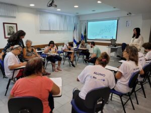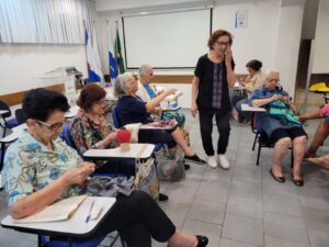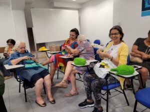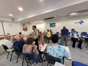 Os grupos de convivência de idosos são reuniões com pessoas da terceira idade que têm como objetivo aumentar a qualidade de vida dos participantes através de atividades, rodas de conversas e trocas de experiências. Durante os encontros são propostas opções dinâmicas e diferenciadas, podendo incluir atividades físicas, passeios, arteterapia, musicoterapia, palestras sobre saúde na terceira idade, rodas de conversa e eventos comemorativos. Com isso, entende-se que cada grupo desenvolverá as atividades de acordo com o seu público, assim como também será definida a periodicidade dos encontros e os horários. Desta forma, no auditório da OTICS-Rio Copacabana, na tarde da segunda-feira, dia 26/06/2023, ocorreu a reunião do grupo de convivência do CMS João Barros Barreto, liderado pela assistente social da unidade de saúde, Zilmar, que se reúne com senhoras para uma aula de tricô e crochê e para desenvolver atividades que tornam este encontro sempre muito agradável e prazeroso para todas elas.