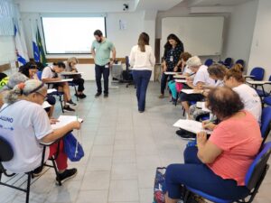 Na manhã desta quinta-feira, dia 29/06/2023, no auditório da OTICS-Rio Copacabana, a fonoaudióloga Carolina Aguilar e a terapeuta ocupacional Karla Mitoso, ambas do CMS João Barros Barreto, se reuniram com um grupos de idosos para a realização de atividades com o objetivo de promover a reabilitação cognitiva dos pacientes, nada de hoje contanto também com a participação do estagiário de Odontologia da unidade de saúde, Estevan. A reabilitação cognitiva consiste em um conjunto de práticas que tem como objetivo reduzir os déficits causados por problemas neurológicos, como Alzheimer, AVC, doença de Parkinson entre outros, garantindo que o paciente tenha autonomia e independência funcional no maior nível possível. O ideal é que a reabilitação seja conduzida por uma equipe multidisciplinar, composta por especialistas de diversas áreas, já que os pacientes que sofrem de problemas neurológicos e neuropsiquiátricas apresentam múltiplas sequelas e, assim, os recursos próprios de cada área poderão estimular os processos mentais e cognitivos deles. Ou seja, o fonoaudiólogo promoverá a melhora da linguagem, o fisioterapeuta a motora e assim sucessivamente.